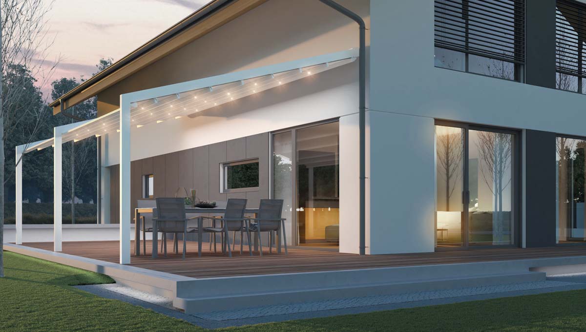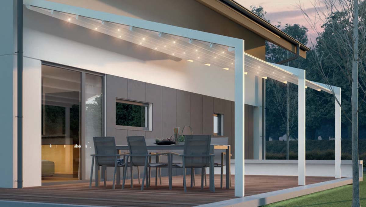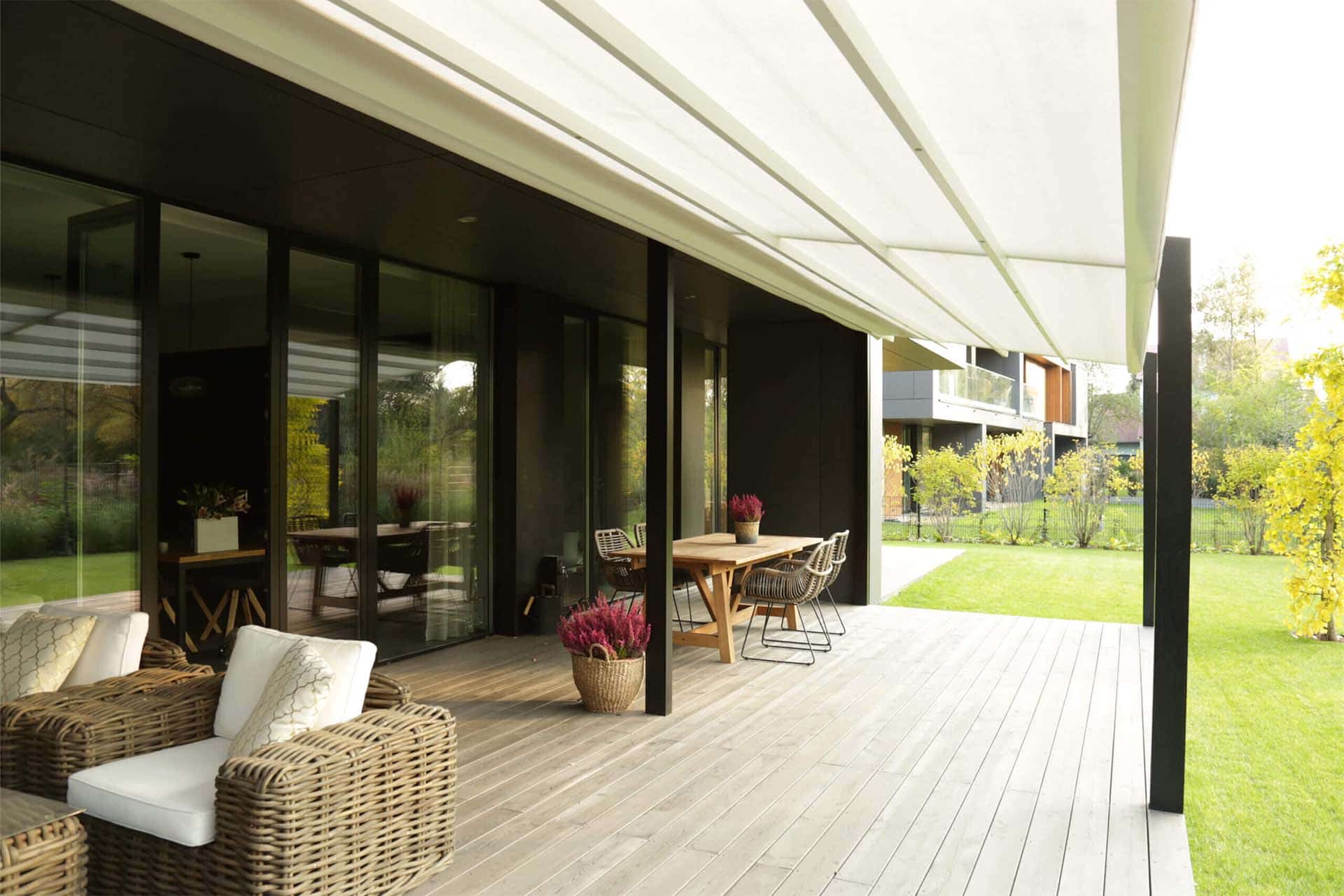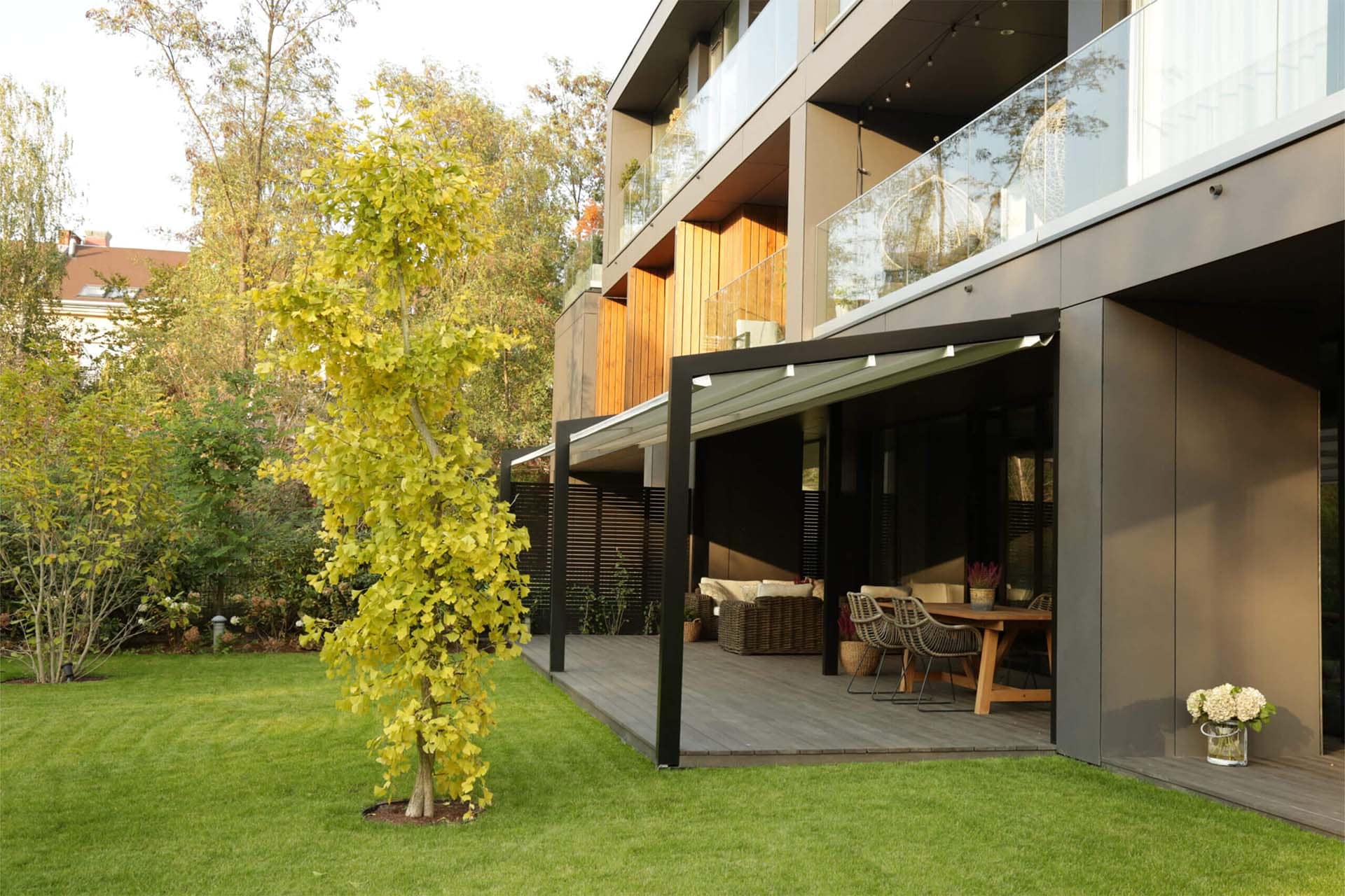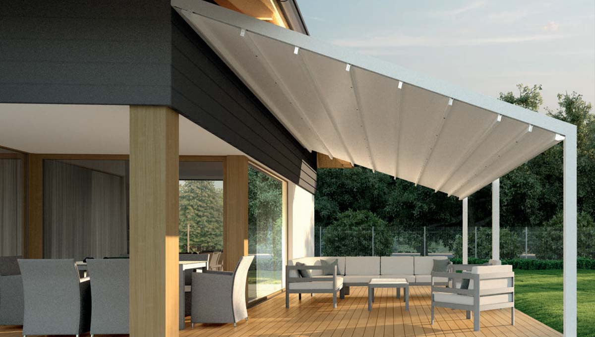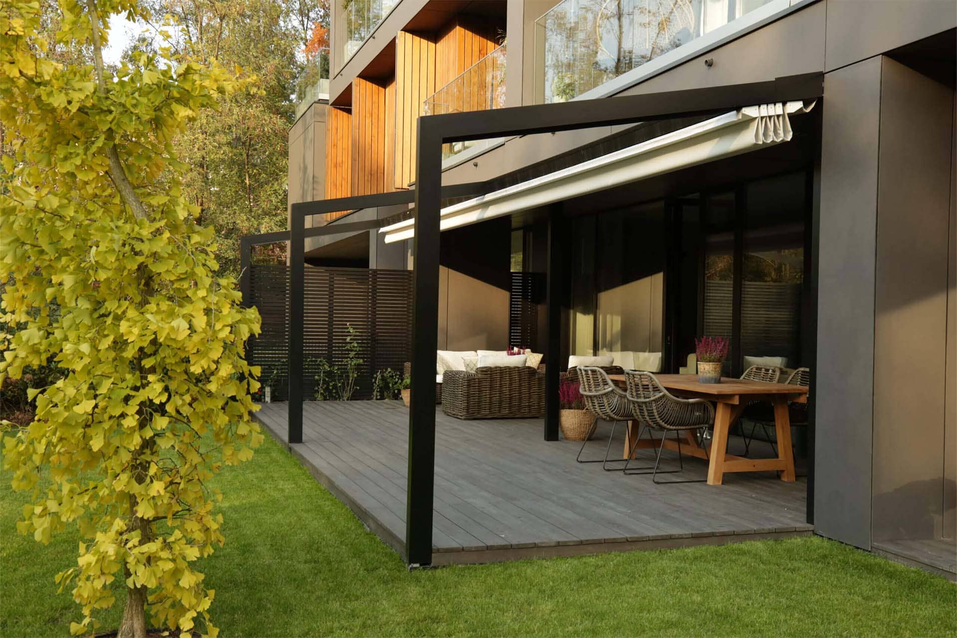 Odkryj pergolę ze składanym dachem z tkaniny. Dzięki smukłym liniom i spadzistemu dachowi oferuje wiele korzyści dla tarasów.