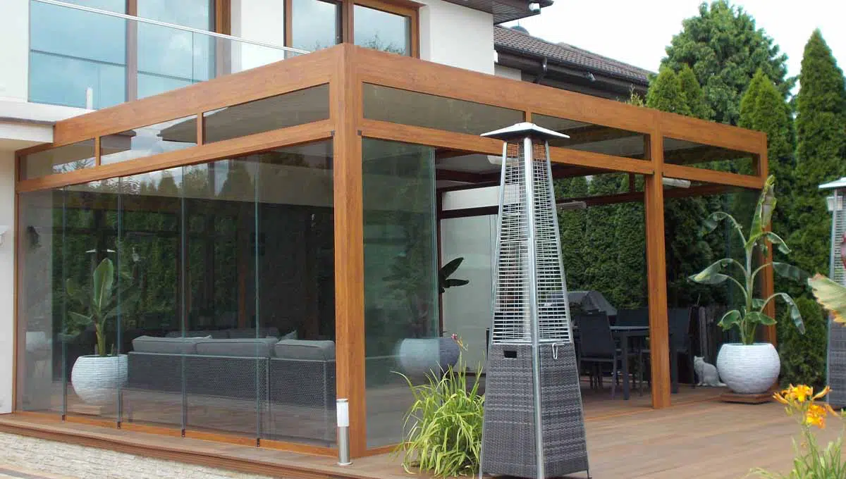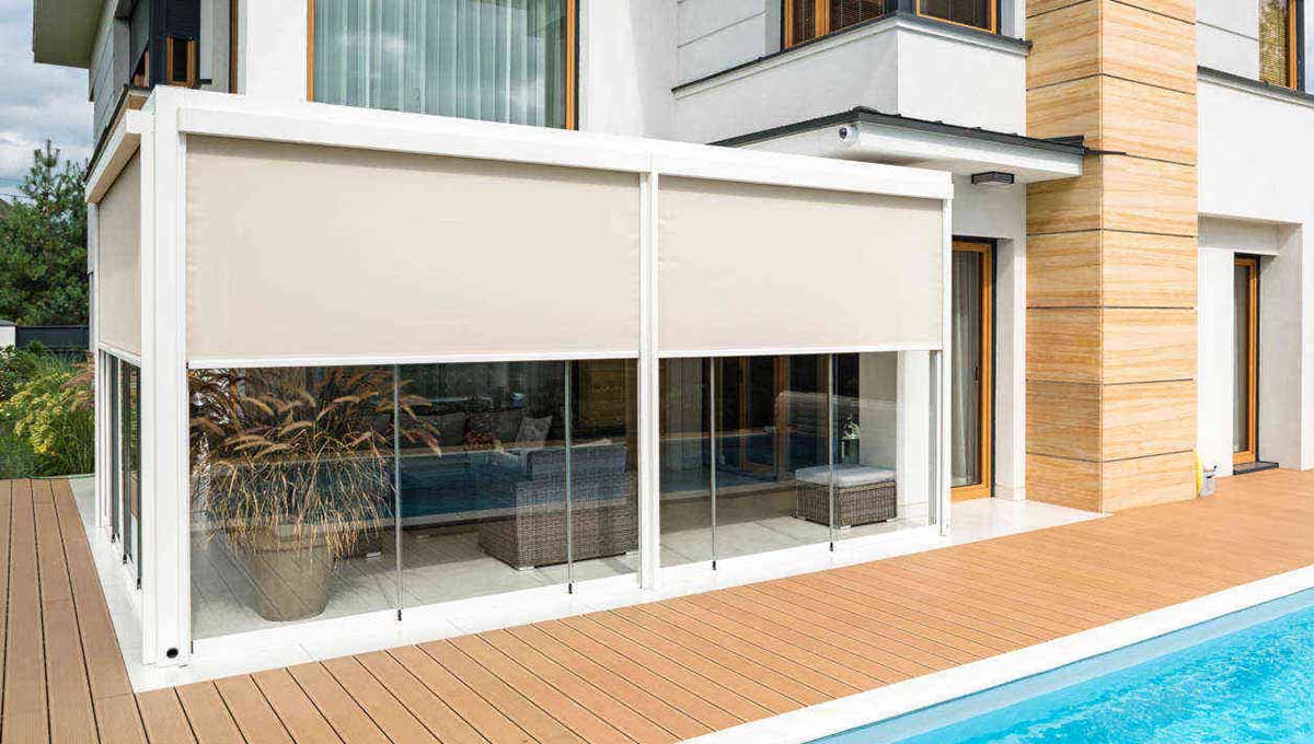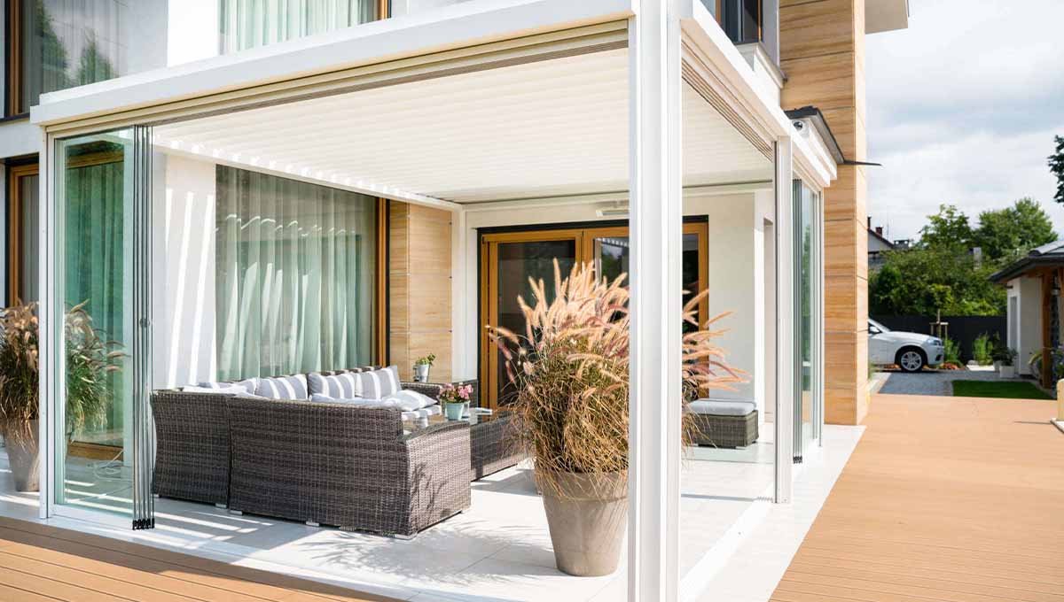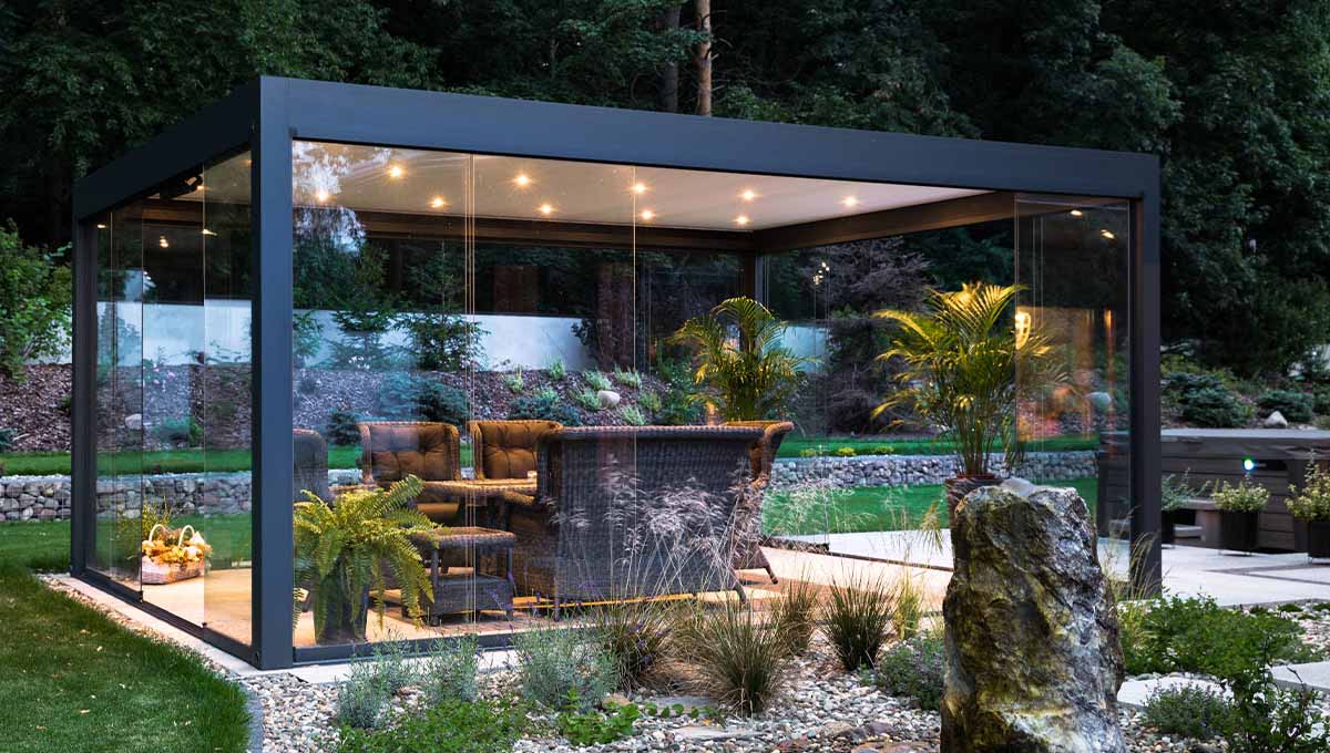 Capteur de vent, Capteur de pluie, Capteur de neige, Radiateur infrarouge, Spots leds, Bande leds périphérique, Système audio, Cloisons vitrées coulissantes, Store zip extérieur